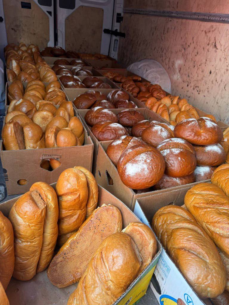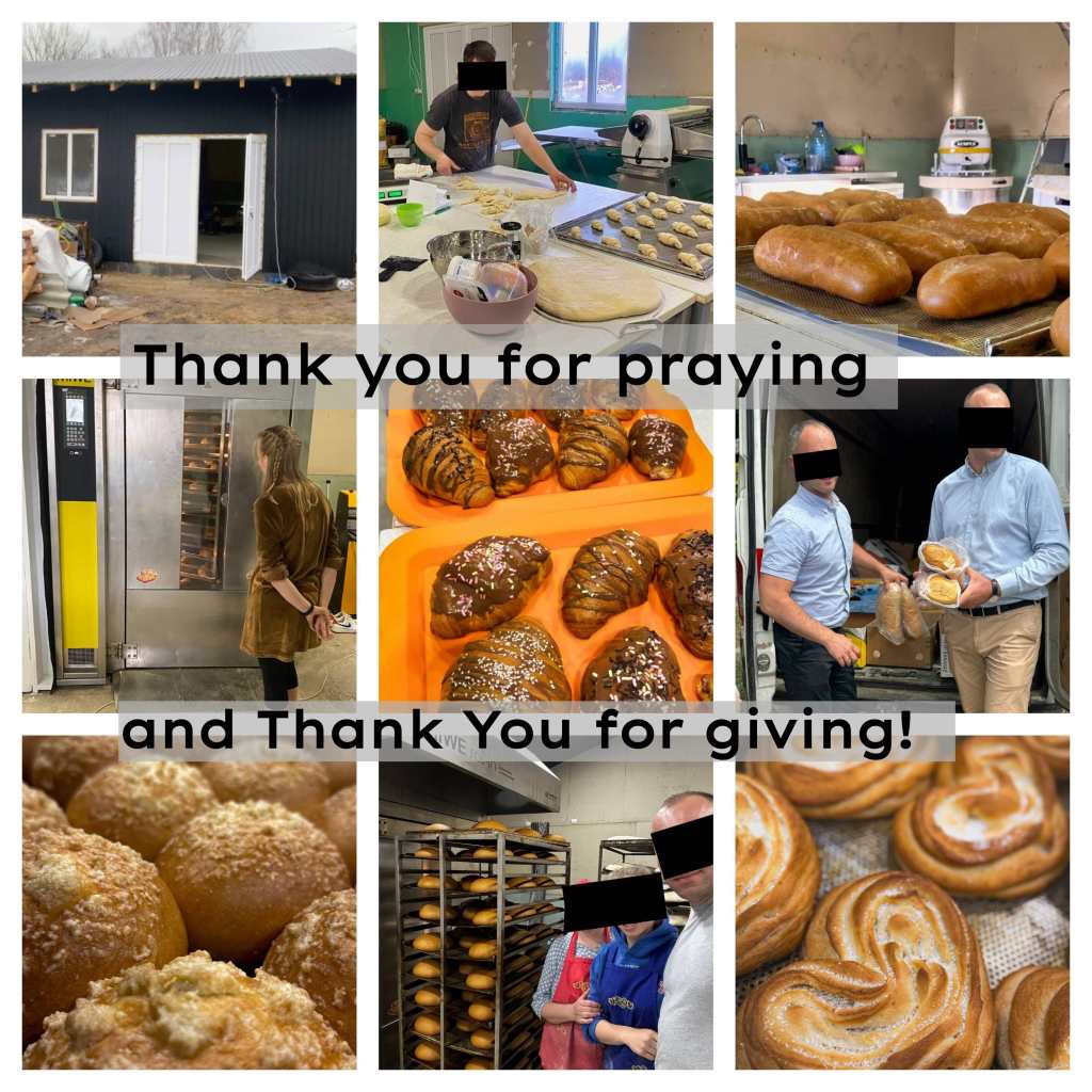 When the building was complete, we were able to get the bakery outfitted. Then they began to bake, and bake, and bake some more. They baked brown bread, and white bread. They baked rolls and croissants. Some of their bread was taken to stores and kiosks for sale, but at least twice a week they bake twice as much. On these days the bread is taken to villages closer to the front, where people hear the good news about the Bread of Life. These events are in partnership with local pastors who follow up on the recipients of this delicious and wholesome bread. The bread shown here is actually going to Ukrainians in need.